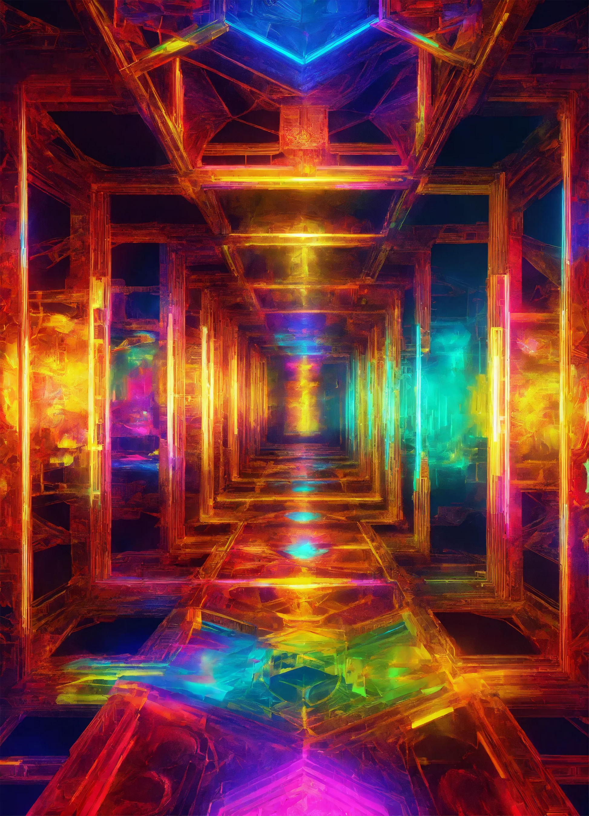 In certain areas of the artwork, the hallway becomes treacherous, marred by cracks and holes in the floor, symbolic of the obstacles that often arise when one is least prepared. These cracks represent the fears, doubts, and challenges that seem to appear when one is moving forward at full speed—reminders that the pursuit of greatness is not without its perils. The subtle interplay of light and shadow within these sections serves as a cautionary tale: even when one feels confident in their stride, it is essential to maintain awareness and vigilance. The cracks remind us of the fragility of our progress, urging us to stay grounded and vigilant, no matter how close we may be to reaching our destination.