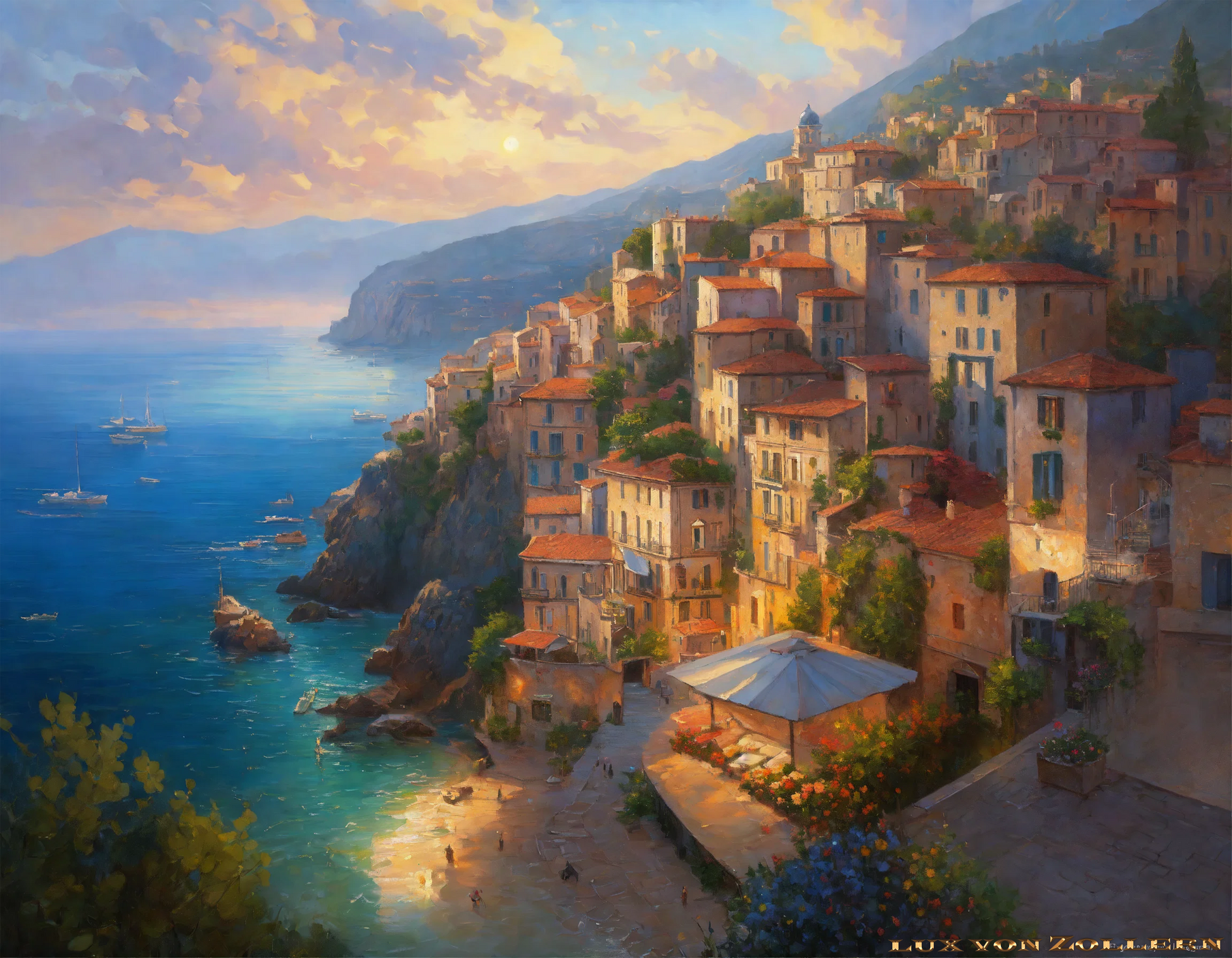 Ultimately, the interplay of light and color in "Rich Rewards by Lux von Zollern" elevates the collection from a mere representation of a Mediterranean landscape to a visual metaphor for the human experience. The collection captures both the struggle and the joy of pursuing one’s dreams, as well as the ultimate fulfillment that comes with achieving them. The light represents the guidance and clarity that help us navigate the path, while the colors evoke the range of emotions and experiences that define the journey.