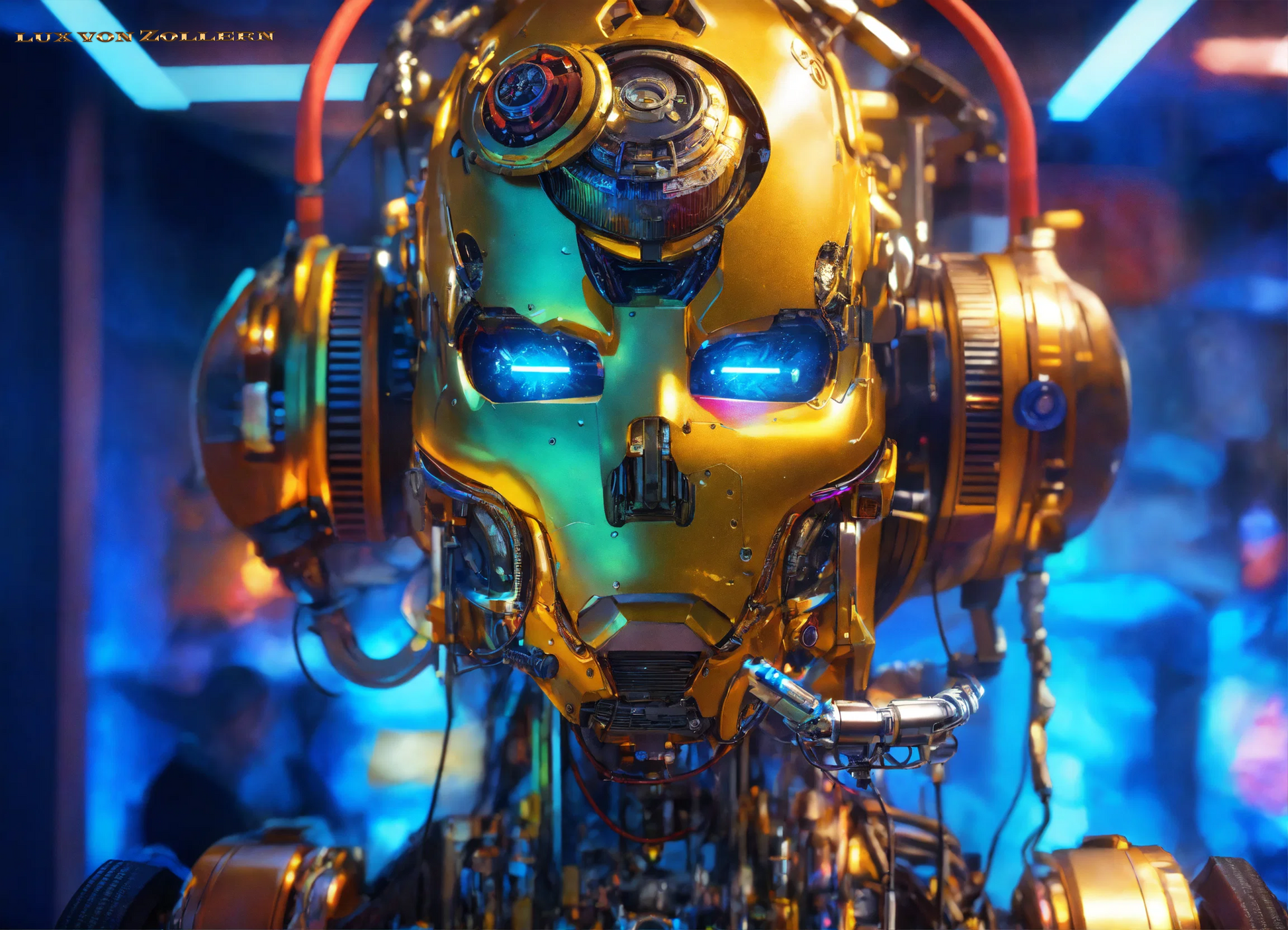 One of the most striking aspects of this collection is the incredible attention to detail in each piece. Lux von Zollern’s artistic mastery is immediately evident in the way each robot head is meticulously constructed. The deep gold hues that dominate the surface of the faces are not simply color choices, but rather intentional gestures that evoke a sense of timeless opulence. The gold of the robot’s face is reminiscent of the Egyptian pharaoh’s funerary mask, with its weight of history, culture, and legacy. Just as these masks symbolized the rulers' eternal power, so too do these robotic visages speak to the growing dominance of Artificial Intelligence in our modern world. The gold surface reflects light in hypnotic ways, drawing the eye to its polished, metallic texture, a surface that is both alien and familiar, luxurious yet unsettling. It gleams with an almost supernatural quality, reminding us of the allure of technology and the seductive promise it holds.
