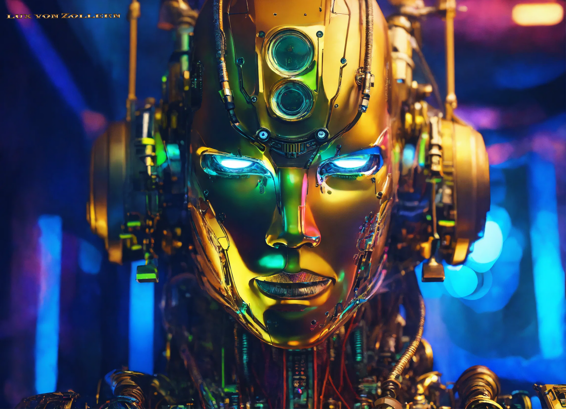 One of the most striking aspects of this collection is the incredible attention to detail in each piece. Lux von Zollern’s artistic mastery is immediately evident in the way each robot head is meticulously constructed. The deep gold hues that dominate the surface of the faces are not simply color choices, but rather intentional gestures that evoke a sense of timeless opulence. The gold of the robot’s face is reminiscent of the Egyptian pharaoh’s funerary mask, with its weight of history, culture, and legacy. Just as these masks symbolized the rulers' eternal power, so too do these robotic visages speak to the growing dominance of Artificial Intelligence in our modern world. The gold surface reflects light in hypnotic ways, drawing the eye to its polished, metallic texture, a surface that is both alien and familiar, luxurious yet unsettling. It gleams with an almost supernatural quality, reminding us of the allure of technology and the seductive promise it holds.