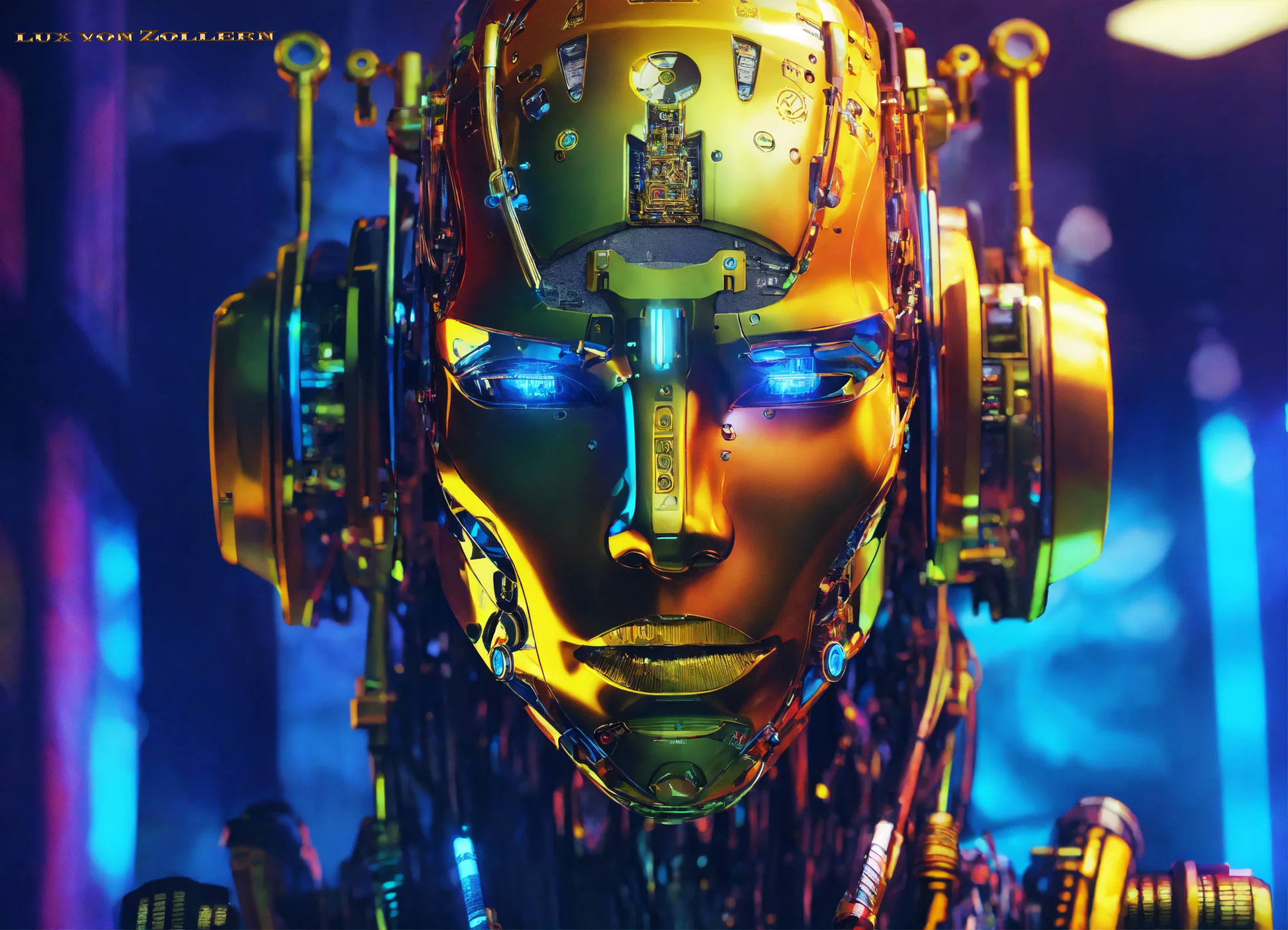One of the most striking aspects of this collection is the incredible attention to detail in each piece. Lux von Zollern’s artistic mastery is immediately evident in the way each robot head is meticulously constructed. The deep gold hues that dominate the surface of the faces are not simply color choices, but rather intentional gestures that evoke a sense of timeless opulence. The gold of the robot’s face is reminiscent of the Egyptian pharaoh’s funerary mask, with its weight of history, culture, and legacy. Just as these masks symbolized the rulers' eternal power, so too do these robotic visages speak to the growing dominance of Artificial Intelligence in our modern world. The gold surface reflects light in hypnotic ways, drawing the eye to its polished, metallic texture, a surface that is both alien and familiar, luxurious yet unsettling. It gleams with an almost supernatural quality, reminding us of the allure of technology and the seductive promise it holds.
