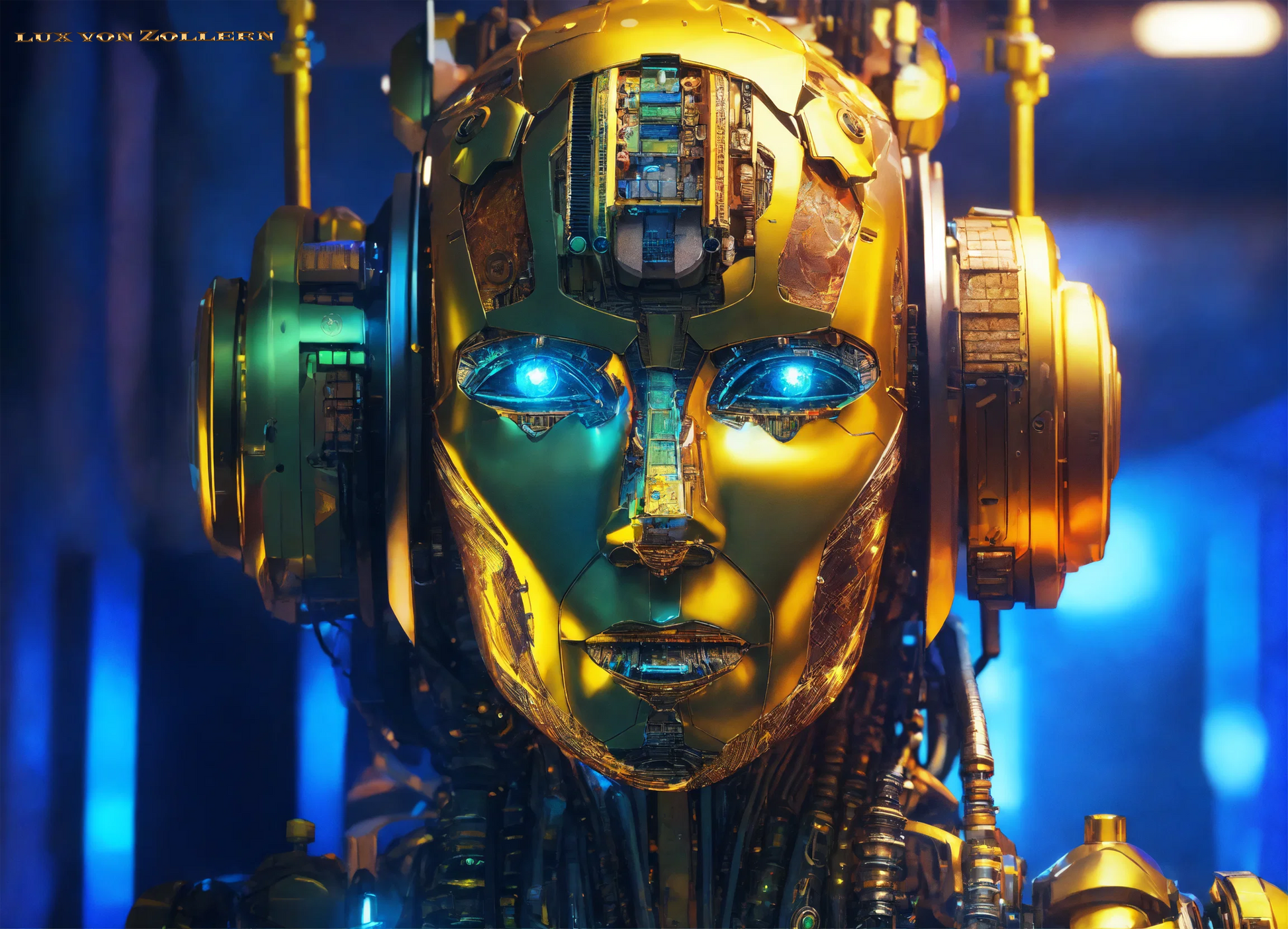 One of the most striking aspects of this collection is the incredible attention to detail in each piece. Lux von Zollern’s artistic mastery is immediately evident in the way each robot head is meticulously constructed. The deep gold hues that dominate the surface of the faces are not simply color choices, but rather intentional gestures that evoke a sense of timeless opulence. The gold of the robot’s face is reminiscent of the Egyptian pharaoh’s funerary mask, with its weight of history, culture, and legacy. Just as these masks symbolized the rulers' eternal power, so too do these robotic visages speak to the growing dominance of Artificial Intelligence in our modern world. The gold surface reflects light in hypnotic ways, drawing the eye to its polished, metallic texture, a surface that is both alien and familiar, luxurious yet unsettling. It gleams with an almost supernatural quality, reminding us of the allure of technology and the seductive promise it holds.