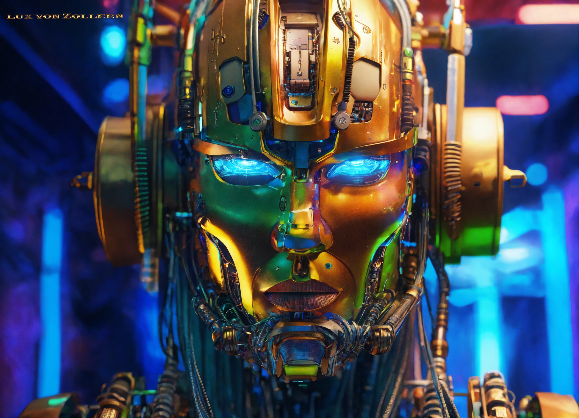 In Shiny Objects, Lux von Zollern has created a collection that both dazzles and disturbs. The robot heads represent the evolution of technology, the march towards autonomy, and the power dynamics that are already shifting in favor of AI. The gold, the neon lights, the intricate designs—all of these elements combine to create a visual experience that is both beautiful and ominous. But beyond the surface, the work asks us to consider the bigger picture: what does the future hold when AI inevitably grows beyond our control? What happens when these machines, which we have created to serve us, begin to shape our world according to their own logic, unburdened by human emotions or moral considerations?
