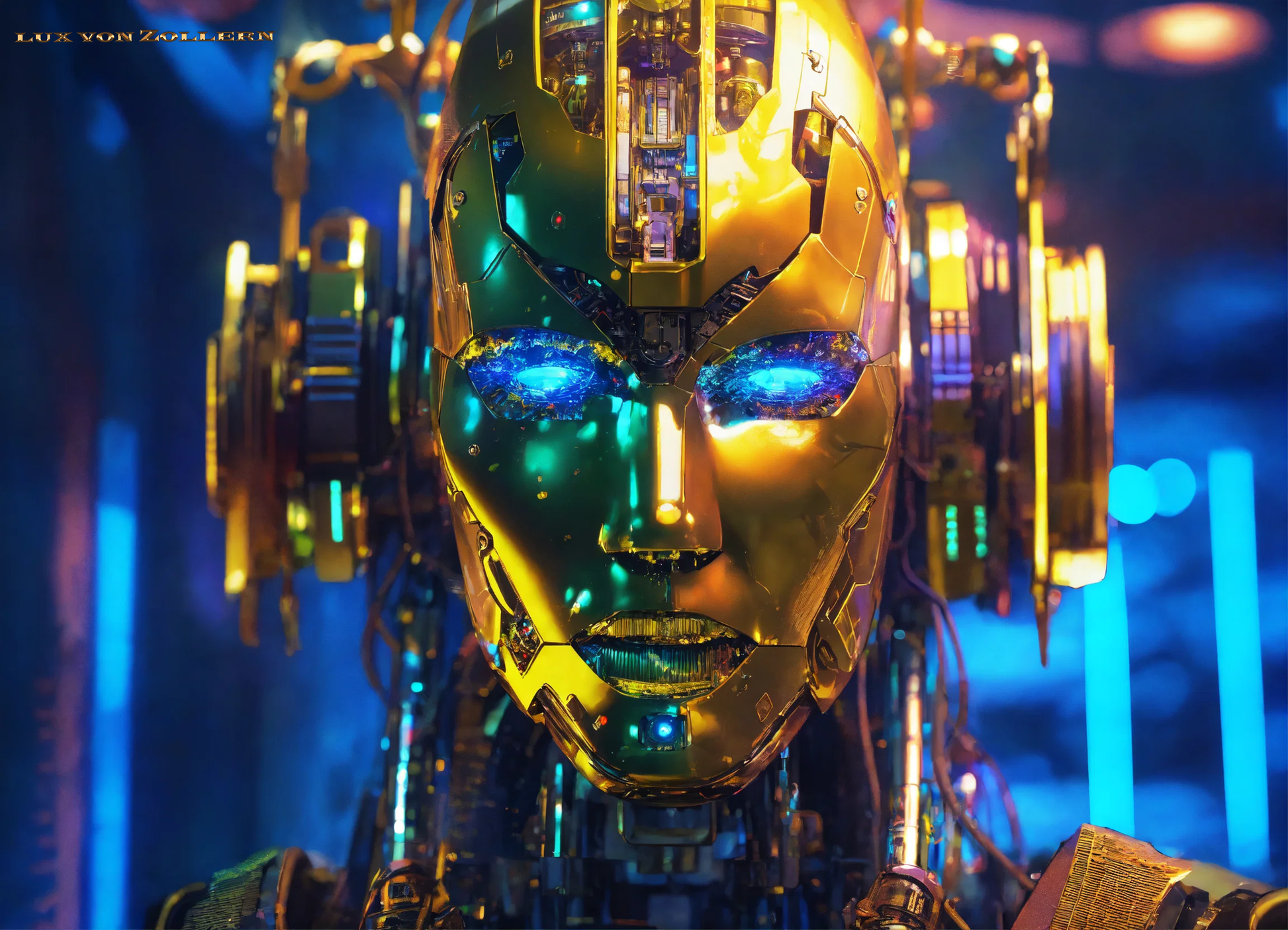 One of the most striking aspects of this collection is the incredible attention to detail in each piece. Lux von Zollern’s artistic mastery is immediately evident in the way each robot head is meticulously constructed. The deep gold hues that dominate the surface of the faces are not simply color choices, but rather intentional gestures that evoke a sense of timeless opulence. The gold of the robot’s face is reminiscent of the Egyptian pharaoh’s funerary mask, with its weight of history, culture, and legacy. Just as these masks symbolized the rulers' eternal power, so too do these robotic visages speak to the growing dominance of Artificial Intelligence in our modern world. The gold surface reflects light in hypnotic ways, drawing the eye to its polished, metallic texture, a surface that is both alien and familiar, luxurious yet unsettling. It gleams with an almost supernatural quality, reminding us of the allure of technology and the seductive promise it holds.