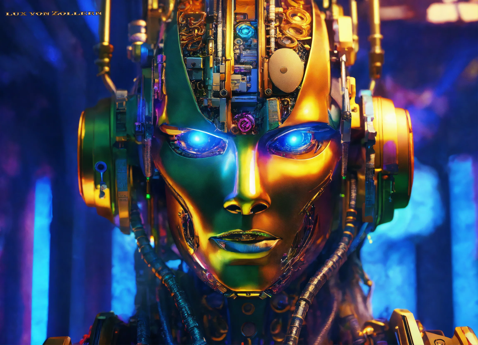 One of the most striking aspects of this collection is the incredible attention to detail in each piece. Lux von Zollern’s artistic mastery is immediately evident in the way each robot head is meticulously constructed. The deep gold hues that dominate the surface of the faces are not simply color choices, but rather intentional gestures that evoke a sense of timeless opulence. The gold of the robot’s face is reminiscent of the Egyptian pharaoh’s funerary mask, with its weight of history, culture, and legacy. Just as these masks symbolized the rulers' eternal power, so too do these robotic visages speak to the growing dominance of Artificial Intelligence in our modern world. The gold surface reflects light in hypnotic ways, drawing the eye to its polished, metallic texture, a surface that is both alien and familiar, luxurious yet unsettling. It gleams with an almost supernatural quality, reminding us of the allure of technology and the seductive promise it holds.