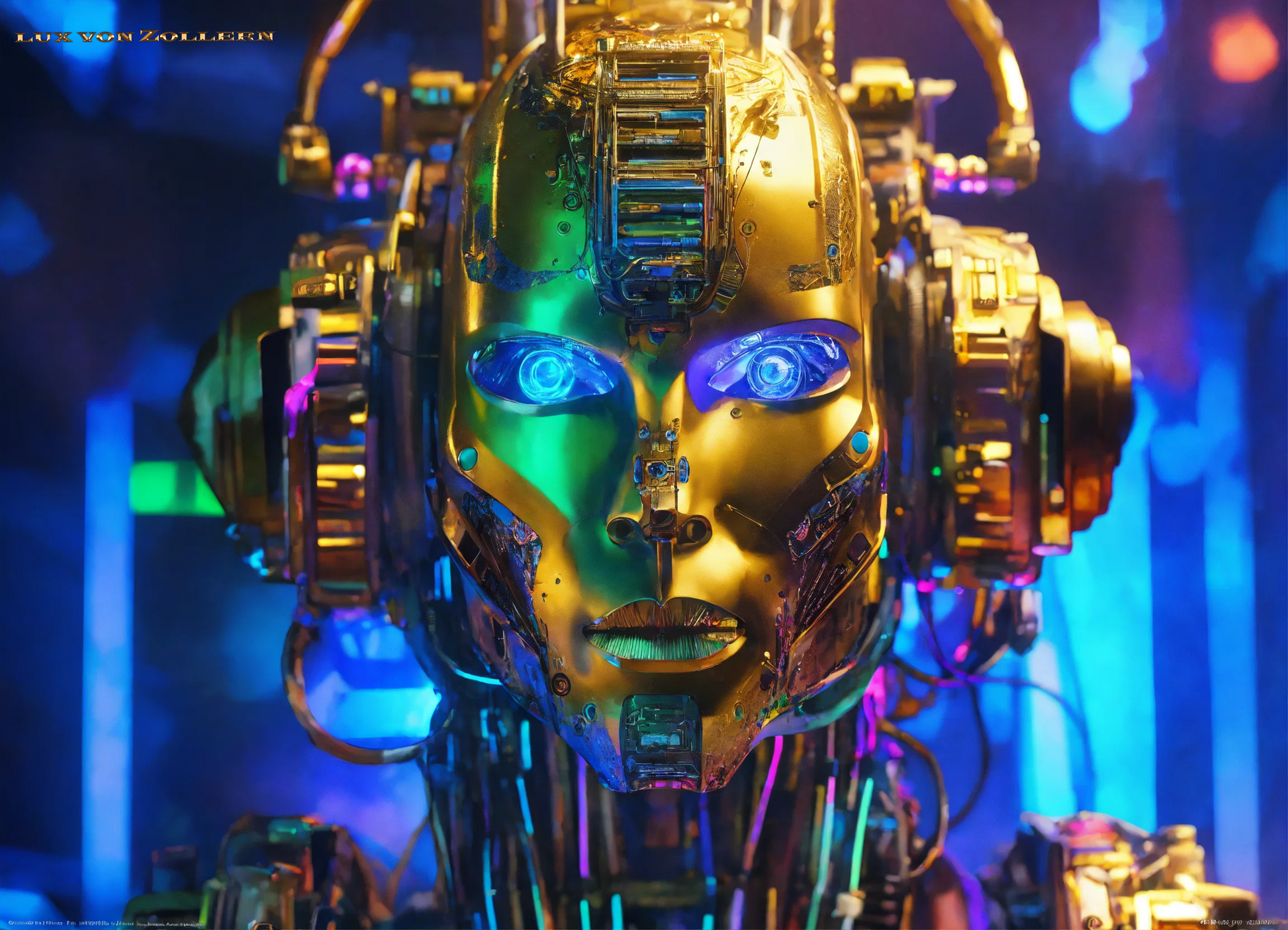 One of the most striking aspects of this collection is the incredible attention to detail in each piece. Lux von Zollern’s artistic mastery is immediately evident in the way each robot head is meticulously constructed. The deep gold hues that dominate the surface of the faces are not simply color choices, but rather intentional gestures that evoke a sense of timeless opulence. The gold of the robot’s face is reminiscent of the Egyptian pharaoh’s funerary mask, with its weight of history, culture, and legacy. Just as these masks symbolized the rulers' eternal power, so too do these robotic visages speak to the growing dominance of Artificial Intelligence in our modern world. The gold surface reflects light in hypnotic ways, drawing the eye to its polished, metallic texture, a surface that is both alien and familiar, luxurious yet unsettling. It gleams with an almost supernatural quality, reminding us of the allure of technology and the seductive promise it holds.