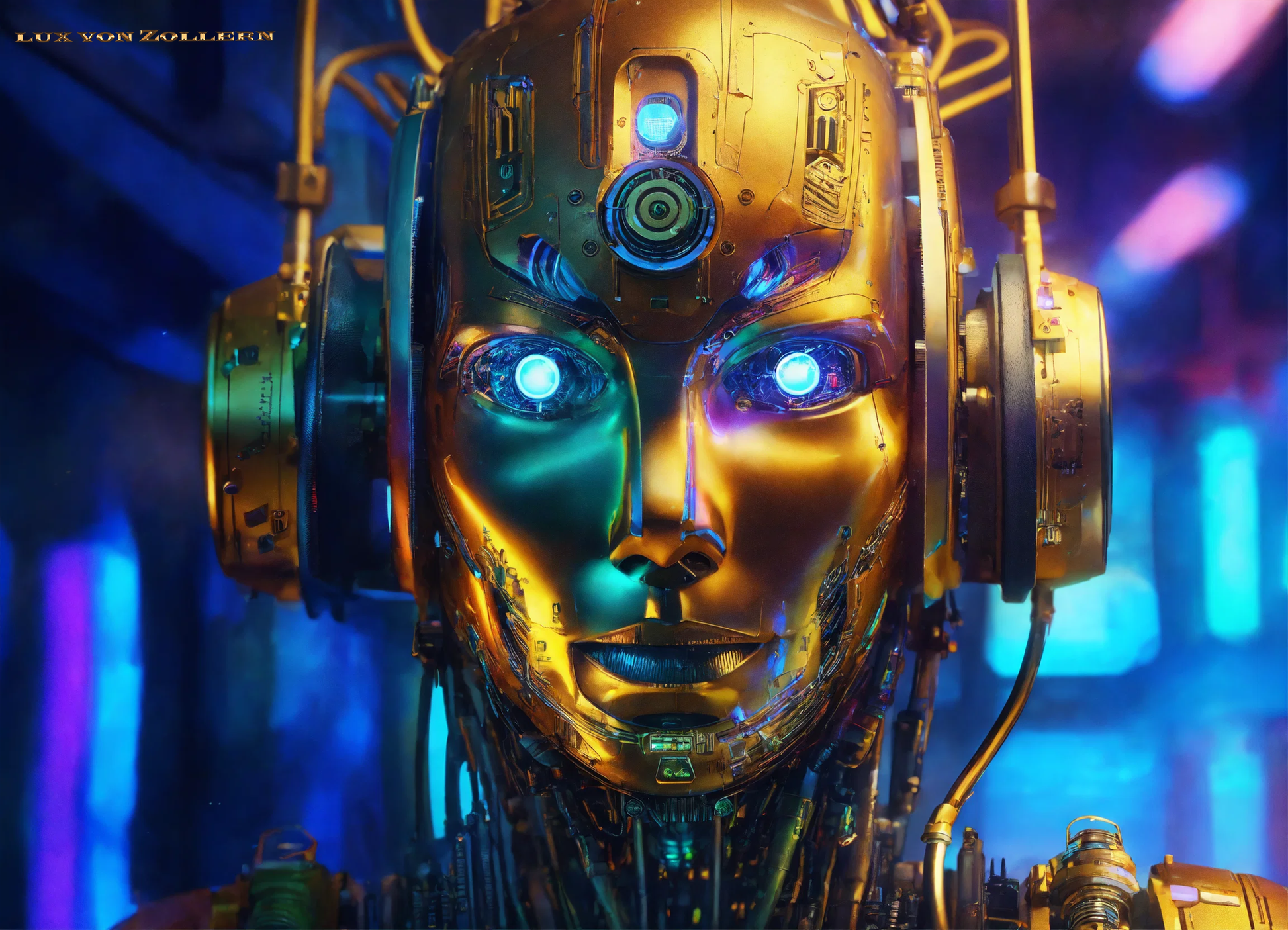 One of the most striking aspects of this collection is the incredible attention to detail in each piece. Lux von Zollern’s artistic mastery is immediately evident in the way each robot head is meticulously constructed. The deep gold hues that dominate the surface of the faces are not simply color choices, but rather intentional gestures that evoke a sense of timeless opulence. The gold of the robot’s face is reminiscent of the Egyptian pharaoh’s funerary mask, with its weight of history, culture, and legacy. Just as these masks symbolized the rulers' eternal power, so too do these robotic visages speak to the growing dominance of Artificial Intelligence in our modern world. The gold surface reflects light in hypnotic ways, drawing the eye to its polished, metallic texture, a surface that is both alien and familiar, luxurious yet unsettling. It gleams with an almost supernatural quality, reminding us of the allure of technology and the seductive promise it holds.