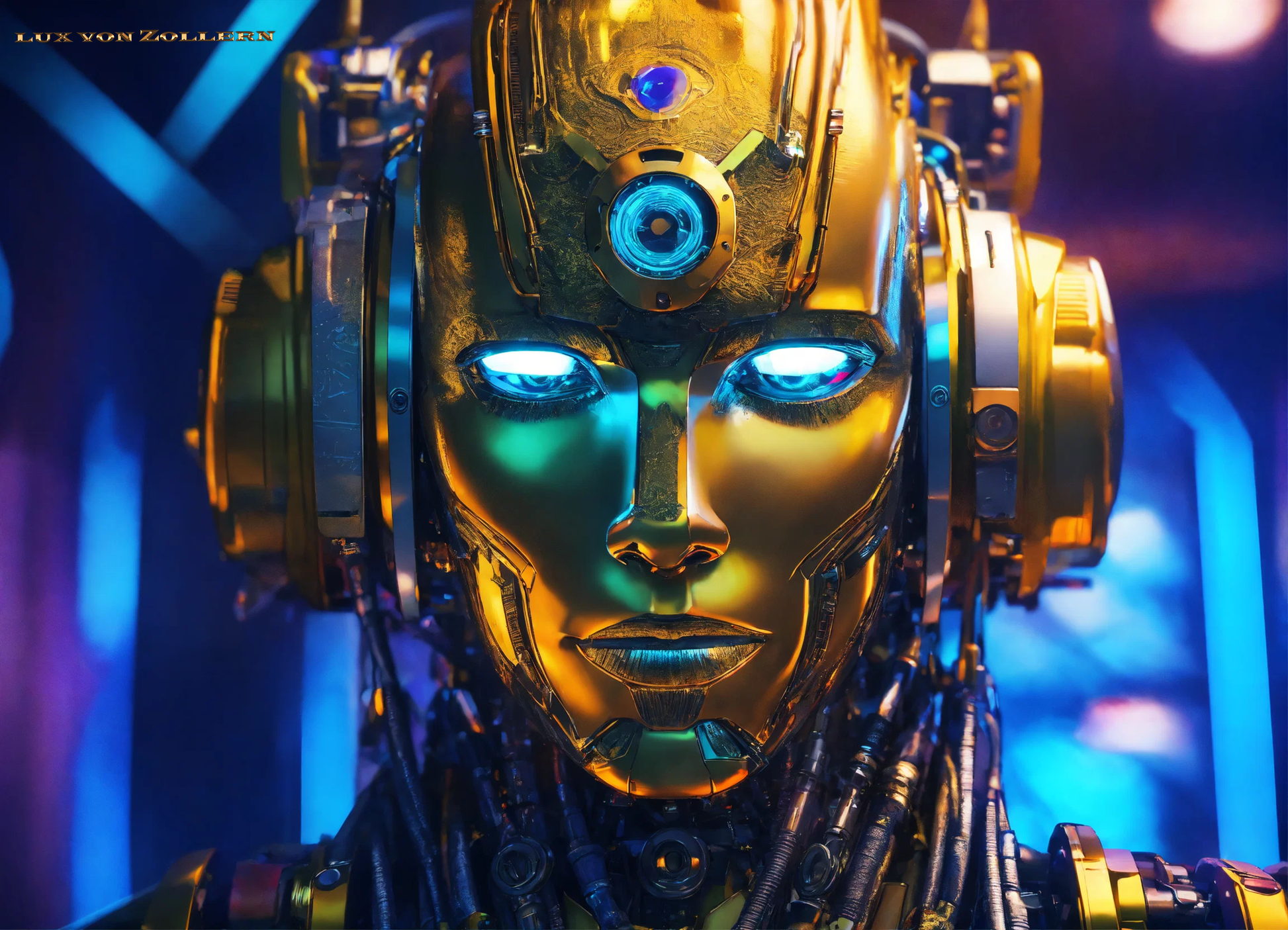 One of the most striking aspects of this collection is the incredible attention to detail in each piece. Lux von Zollern’s artistic mastery is immediately evident in the way each robot head is meticulously constructed. The deep gold hues that dominate the surface of the faces are not simply color choices, but rather intentional gestures that evoke a sense of timeless opulence. The gold of the robot’s face is reminiscent of the Egyptian pharaoh’s funerary mask, with its weight of history, culture, and legacy. Just as these masks symbolized the rulers' eternal power, so too do these robotic visages speak to the growing dominance of Artificial Intelligence in our modern world. The gold surface reflects light in hypnotic ways, drawing the eye to its polished, metallic texture, a surface that is both alien and familiar, luxurious yet unsettling. It gleams with an almost supernatural quality, reminding us of the allure of technology and the seductive promise it holds.