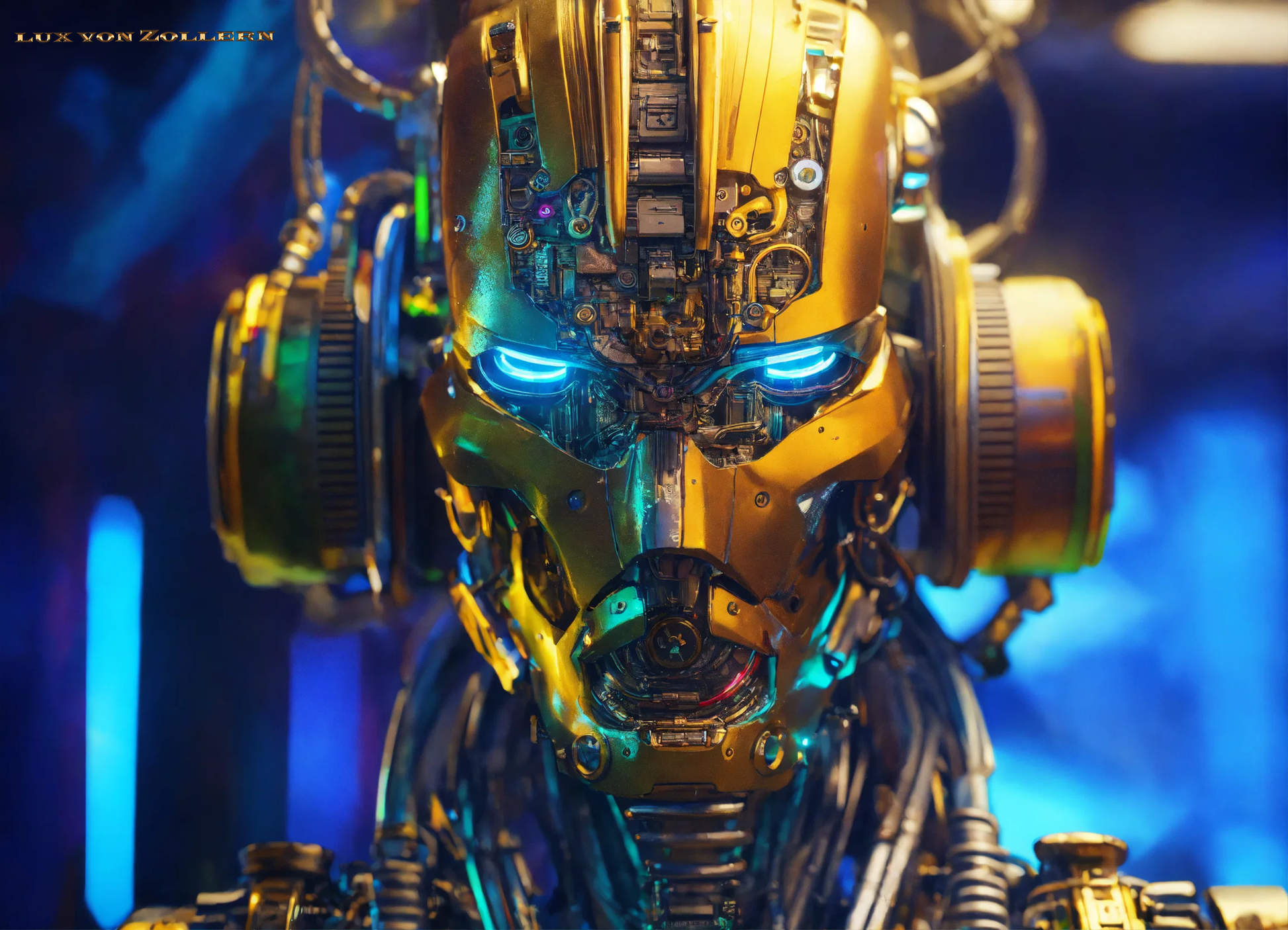 One of the most striking aspects of this collection is the incredible attention to detail in each piece. Lux von Zollern’s artistic mastery is immediately evident in the way each robot head is meticulously constructed. The deep gold hues that dominate the surface of the faces are not simply color choices, but rather intentional gestures that evoke a sense of timeless opulence. The gold of the robot’s face is reminiscent of the Egyptian pharaoh’s funerary mask, with its weight of history, culture, and legacy. Just as these masks symbolized the rulers' eternal power, so too do these robotic visages speak to the growing dominance of Artificial Intelligence in our modern world. The gold surface reflects light in hypnotic ways, drawing the eye to its polished, metallic texture, a surface that is both alien and familiar, luxurious yet unsettling. It gleams with an almost supernatural quality, reminding us of the allure of technology and the seductive promise it holds.
