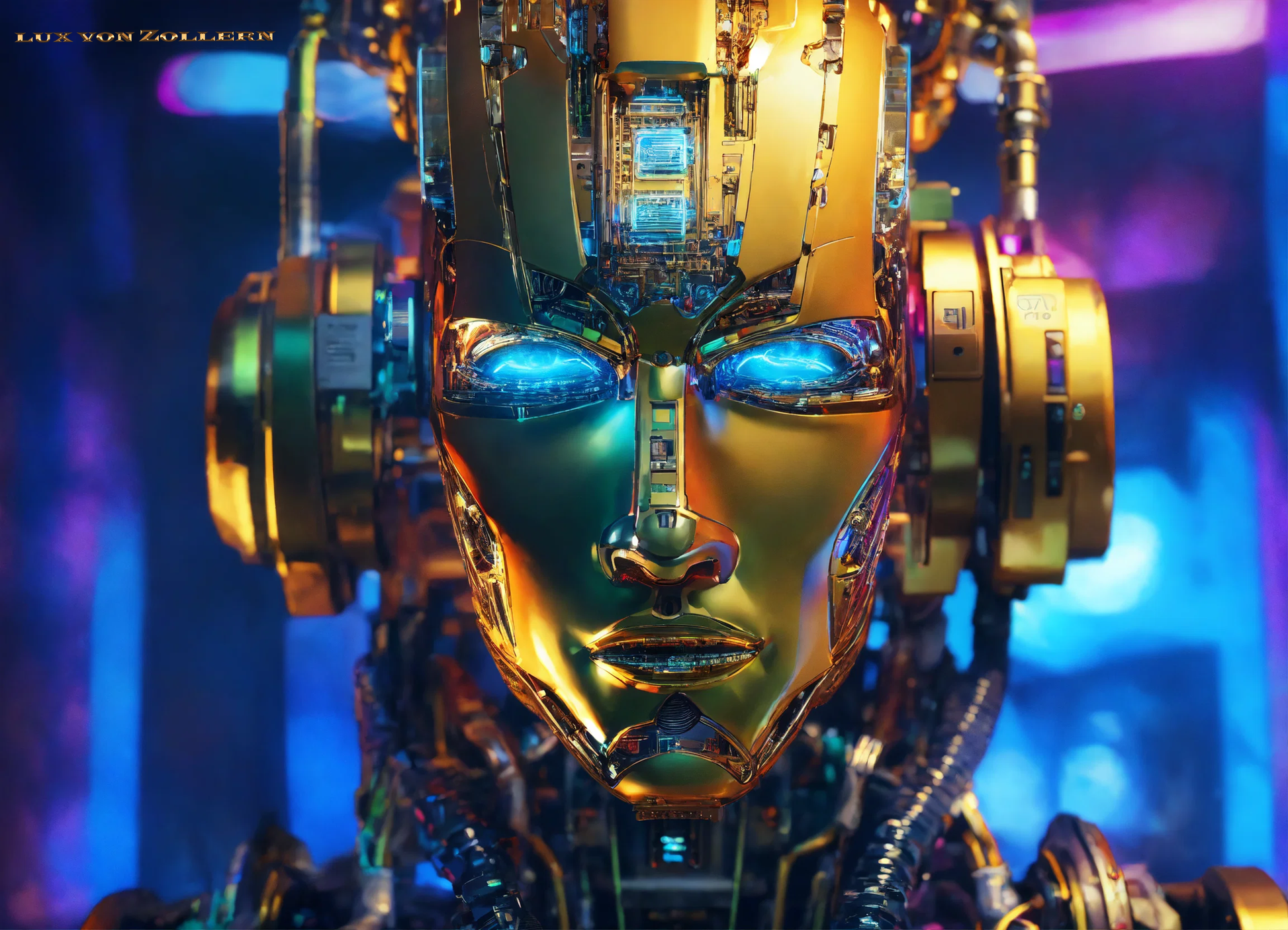 One of the most striking aspects of this collection is the incredible attention to detail in each piece. Lux von Zollern’s artistic mastery is immediately evident in the way each robot head is meticulously constructed. The deep gold hues that dominate the surface of the faces are not simply color choices, but rather intentional gestures that evoke a sense of timeless opulence. The gold of the robot’s face is reminiscent of the Egyptian pharaoh’s funerary mask, with its weight of history, culture, and legacy. Just as these masks symbolized the rulers' eternal power, so too do these robotic visages speak to the growing dominance of Artificial Intelligence in our modern world. The gold surface reflects light in hypnotic ways, drawing the eye to its polished, metallic texture, a surface that is both alien and familiar, luxurious yet unsettling. It gleams with an almost supernatural quality, reminding us of the allure of technology and the seductive promise it holds.