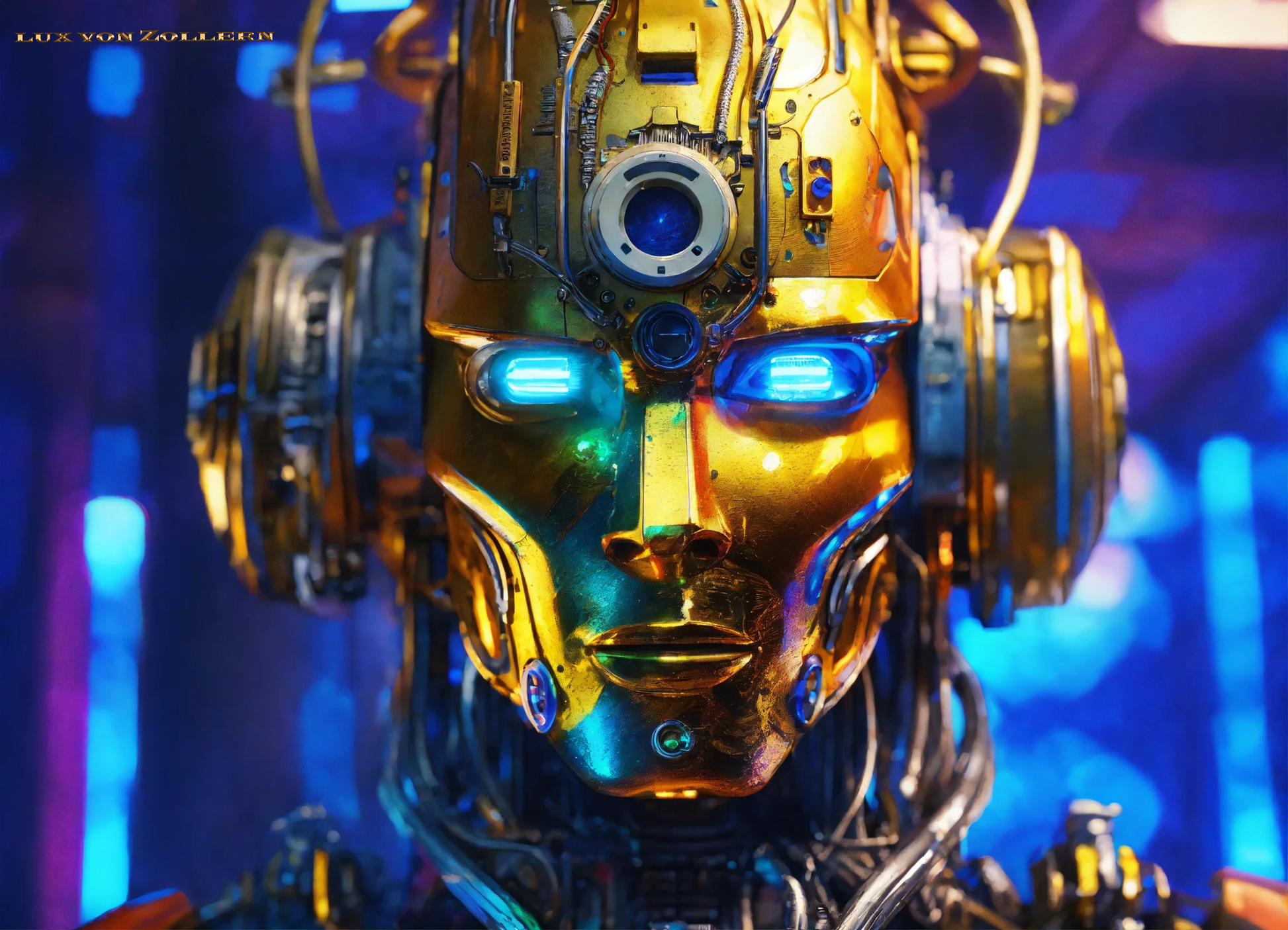 One of the most striking aspects of this collection is the incredible attention to detail in each piece. Lux von Zollern’s artistic mastery is immediately evident in the way each robot head is meticulously constructed. The deep gold hues that dominate the surface of the faces are not simply color choices, but rather intentional gestures that evoke a sense of timeless opulence. The gold of the robot’s face is reminiscent of the Egyptian pharaoh’s funerary mask, with its weight of history, culture, and legacy. Just as these masks symbolized the rulers' eternal power, so too do these robotic visages speak to the growing dominance of Artificial Intelligence in our modern world. The gold surface reflects light in hypnotic ways, drawing the eye to its polished, metallic texture, a surface that is both alien and familiar, luxurious yet unsettling. It gleams with an almost supernatural quality, reminding us of the allure of technology and the seductive promise it holds.