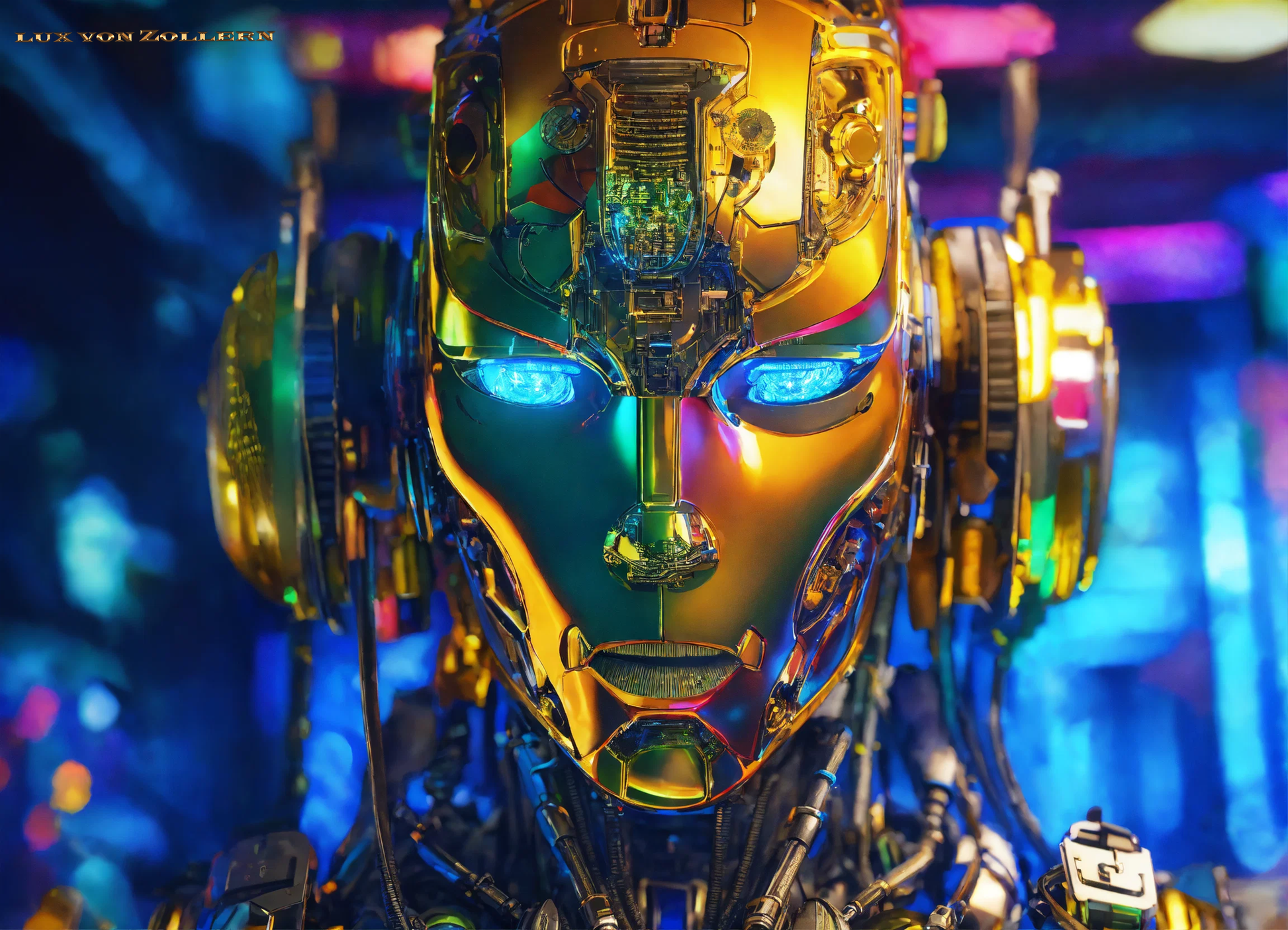 Lux von Zollern’s Shiny Objects collection does more than merely captivate the eye—it compels the viewer to reflect on the relationship between humanity and the technology we have created. As each piece explores the hypnotic brilliance of golden robot heads, these works also open up a broader philosophical conversation about the consequences of our pursuit of Artificial Intelligence (AI). Through intricate details, from the exposed circuits to the electric neon eyes, the collection forces us to confront a pivotal question: as we continue to push the boundaries of technological innovation, are we moving toward an era of enhancement and empowerment, or are we accelerating into a future where humanity is subordinated to the very systems it has built?