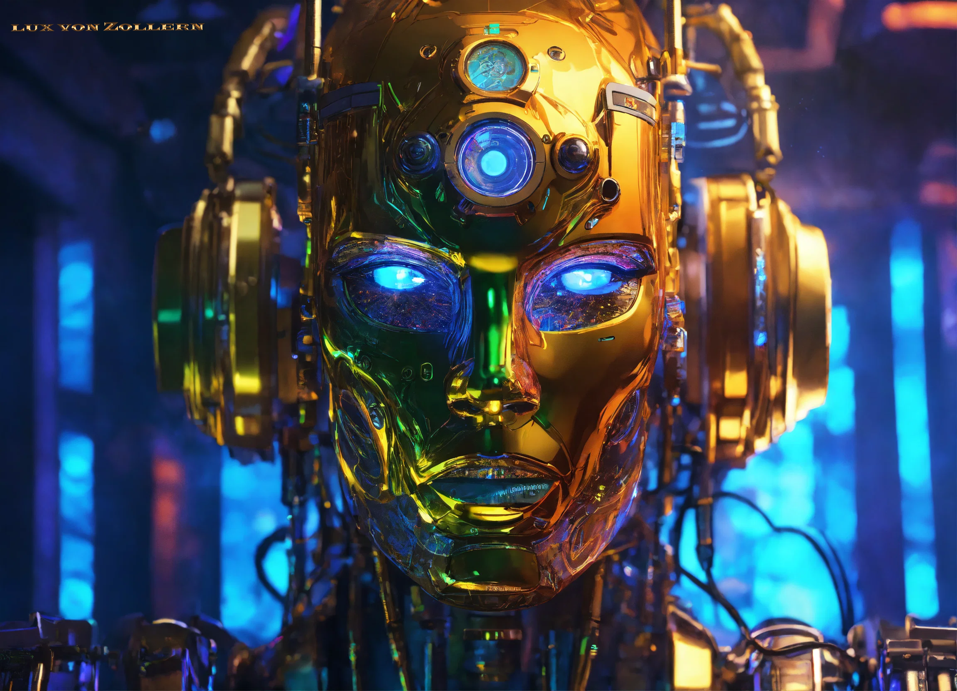 One of the most striking aspects of this collection is the incredible attention to detail in each piece. Lux von Zollern’s artistic mastery is immediately evident in the way each robot head is meticulously constructed. The deep gold hues that dominate the surface of the faces are not simply color choices, but rather intentional gestures that evoke a sense of timeless opulence. The gold of the robot’s face is reminiscent of the Egyptian pharaoh’s funerary mask, with its weight of history, culture, and legacy. Just as these masks symbolized the rulers' eternal power, so too do these robotic visages speak to the growing dominance of Artificial Intelligence in our modern world. The gold surface reflects light in hypnotic ways, drawing the eye to its polished, metallic texture, a surface that is both alien and familiar, luxurious yet unsettling. It gleams with an almost supernatural quality, reminding us of the allure of technology and the seductive promise it holds.