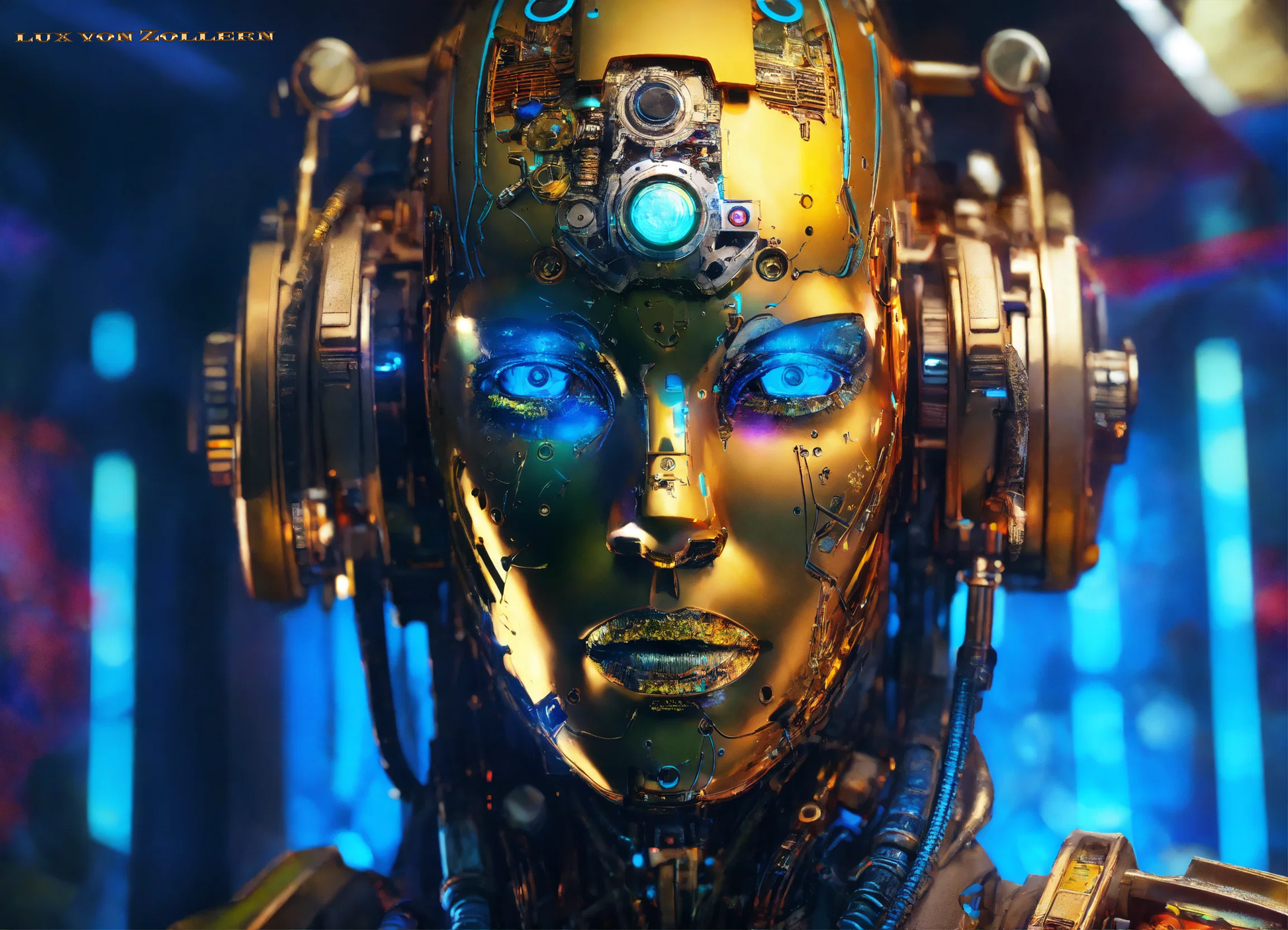In Lux von Zollern's Shiny Objects collection, the glittering golden masks of AI-driven robot heads serve as potent metaphors for the perilous relationship between humanity and the technological progress we so eagerly pursue. The collection's visually stunning depictions of Artificial Intelligence are at once captivating and unsettling, a reflection of both our fascination with technology and the underlying dangers of allowing these systems to gain power over us. As the world rushes to adopt AI in countless aspects of life, from industry to healthcare, education, and even personal interactions, Shiny Objects serves as a warning—a reminder that our pursuit of progress must be tempered with caution, reflection, and a deep awareness of the potential consequences.