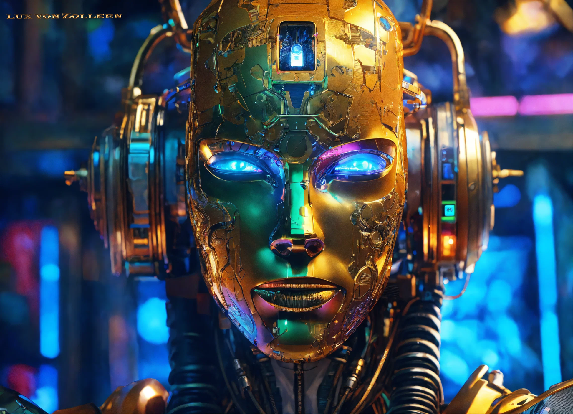 One of the most striking aspects of this collection is the incredible attention to detail in each piece. Lux von Zollern’s artistic mastery is immediately evident in the way each robot head is meticulously constructed. The deep gold hues that dominate the surface of the faces are not simply color choices, but rather intentional gestures that evoke a sense of timeless opulence. The gold of the robot’s face is reminiscent of the Egyptian pharaoh’s funerary mask, with its weight of history, culture, and legacy. Just as these masks symbolized the rulers' eternal power, so too do these robotic visages speak to the growing dominance of Artificial Intelligence in our modern world. The gold surface reflects light in hypnotic ways, drawing the eye to its polished, metallic texture, a surface that is both alien and familiar, luxurious yet unsettling. It gleams with an almost supernatural quality, reminding us of the allure of technology and the seductive promise it holds.