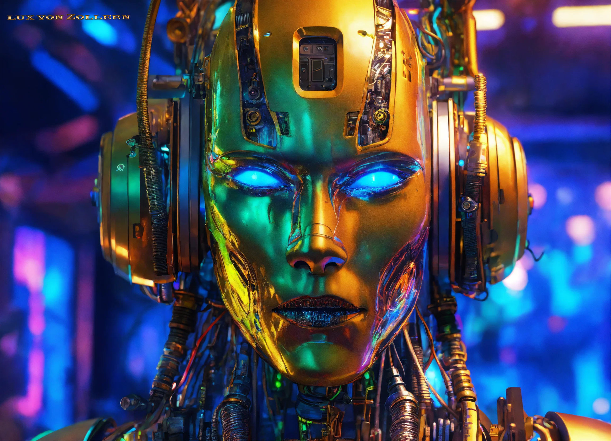 One of the most striking aspects of this collection is the incredible attention to detail in each piece. Lux von Zollern’s artistic mastery is immediately evident in the way each robot head is meticulously constructed. The deep gold hues that dominate the surface of the faces are not simply color choices, but rather intentional gestures that evoke a sense of timeless opulence. The gold of the robot’s face is reminiscent of the Egyptian pharaoh’s funerary mask, with its weight of history, culture, and legacy. Just as these masks symbolized the rulers' eternal power, so too do these robotic visages speak to the growing dominance of Artificial Intelligence in our modern world. The gold surface reflects light in hypnotic ways, drawing the eye to its polished, metallic texture, a surface that is both alien and familiar, luxurious yet unsettling. It gleams with an almost supernatural quality, reminding us of the allure of technology and the seductive promise it holds.