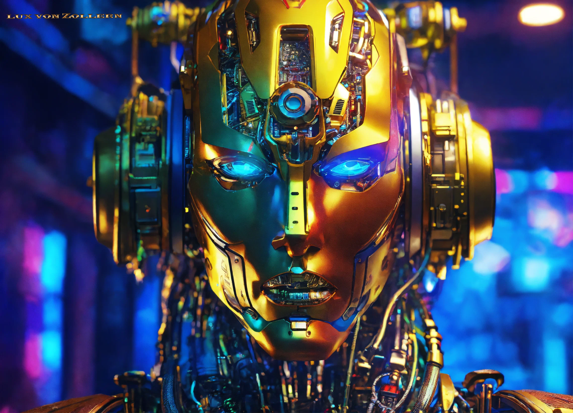In Shiny Objects, Lux von Zollern has created a collection that both dazzles and disturbs. The robot heads represent the evolution of technology, the march towards autonomy, and the power dynamics that are already shifting in favor of AI. The gold, the neon lights, the intricate designs—all of these elements combine to create a visual experience that is both beautiful and ominous. But beyond the surface, the work asks us to consider the bigger picture: what does the future hold when AI inevitably grows beyond our control? What happens when these machines, which we have created to serve us, begin to shape our world according to their own logic, unburdened by human emotions or moral considerations?