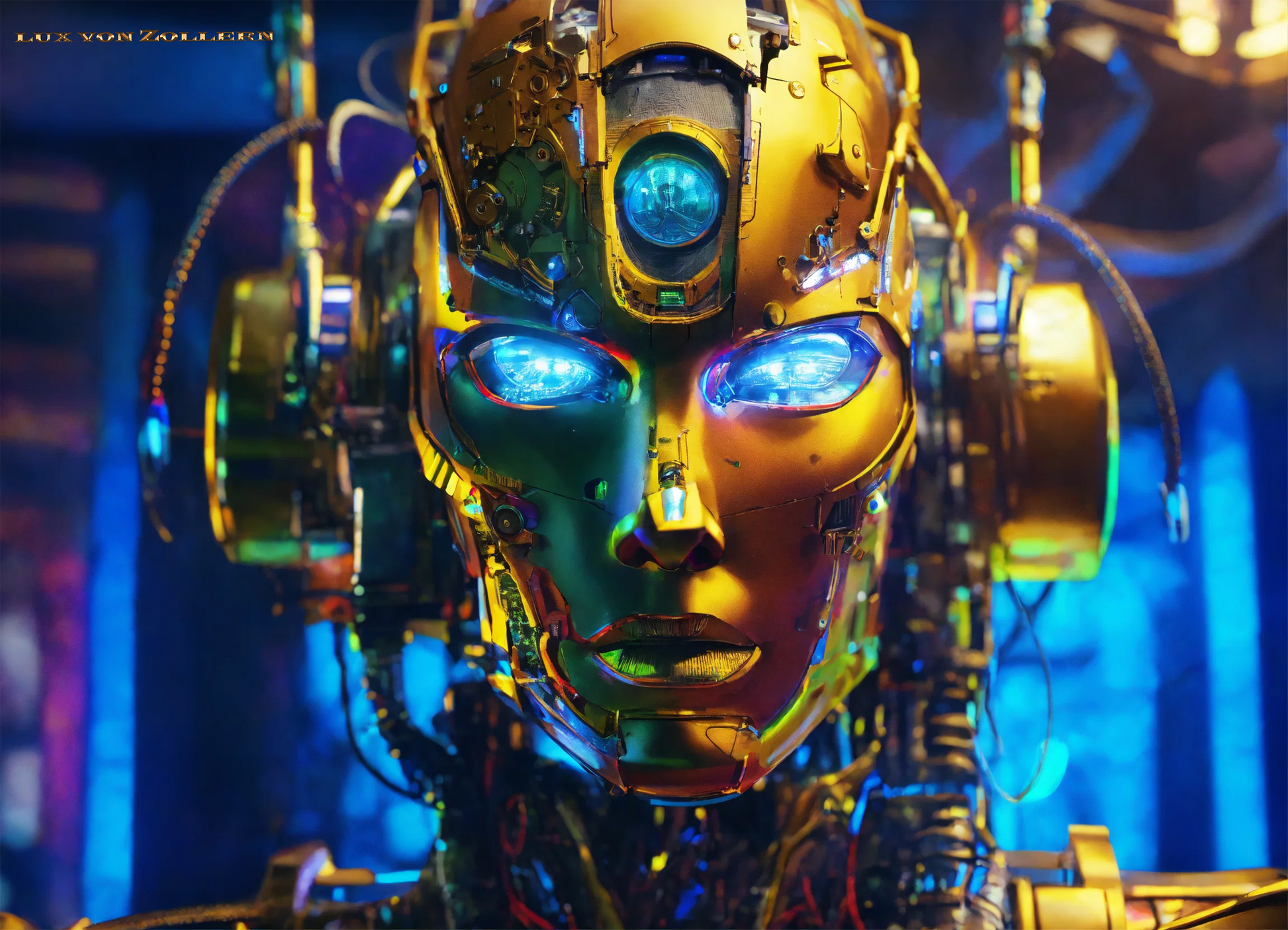 In Lux von Zollern's Shiny Objects collection, the glittering golden masks of AI-driven robot heads serve as potent metaphors for the perilous relationship between humanity and the technological progress we so eagerly pursue. The collection's visually stunning depictions of Artificial Intelligence are at once captivating and unsettling, a reflection of both our fascination with technology and the underlying dangers of allowing these systems to gain power over us. As the world rushes to adopt AI in countless aspects of life, from industry to healthcare, education, and even personal interactions, Shiny Objects serves as a warning—a reminder that our pursuit of progress must be tempered with caution, reflection, and a deep awareness of the potential consequences.