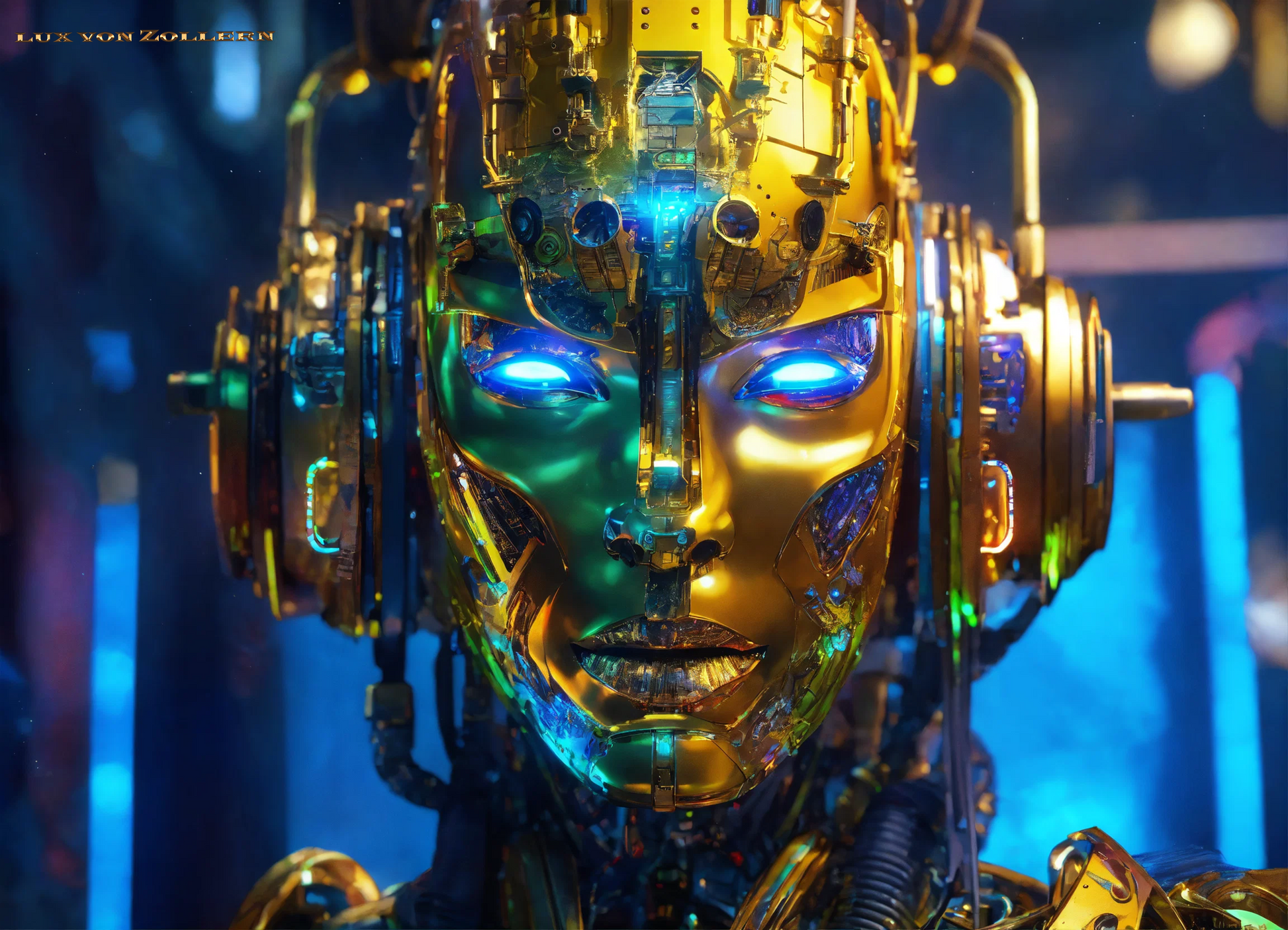 One of the most striking aspects of this collection is the incredible attention to detail in each piece. Lux von Zollern’s artistic mastery is immediately evident in the way each robot head is meticulously constructed. The deep gold hues that dominate the surface of the faces are not simply color choices, but rather intentional gestures that evoke a sense of timeless opulence. The gold of the robot’s face is reminiscent of the Egyptian pharaoh’s funerary mask, with its weight of history, culture, and legacy. Just as these masks symbolized the rulers' eternal power, so too do these robotic visages speak to the growing dominance of Artificial Intelligence in our modern world. The gold surface reflects light in hypnotic ways, drawing the eye to its polished, metallic texture, a surface that is both alien and familiar, luxurious yet unsettling. It gleams with an almost supernatural quality, reminding us of the allure of technology and the seductive promise it holds.