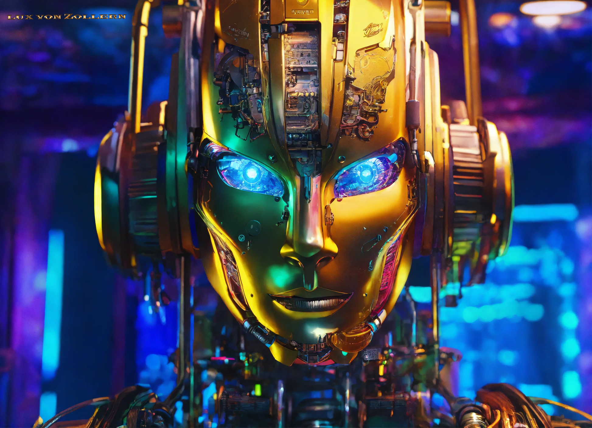 One of the most striking aspects of this collection is the incredible attention to detail in each piece. Lux von Zollern’s artistic mastery is immediately evident in the way each robot head is meticulously constructed. The deep gold hues that dominate the surface of the faces are not simply color choices, but rather intentional gestures that evoke a sense of timeless opulence. The gold of the robot’s face is reminiscent of the Egyptian pharaoh’s funerary mask, with its weight of history, culture, and legacy. Just as these masks symbolized the rulers' eternal power, so too do these robotic visages speak to the growing dominance of Artificial Intelligence in our modern world. The gold surface reflects light in hypnotic ways, drawing the eye to its polished, metallic texture, a surface that is both alien and familiar, luxurious yet unsettling. It gleams with an almost supernatural quality, reminding us of the allure of technology and the seductive promise it holds.