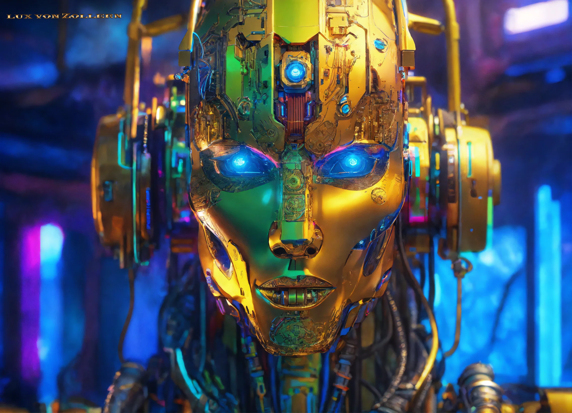One of the most striking aspects of this collection is the incredible attention to detail in each piece. Lux von Zollern’s artistic mastery is immediately evident in the way each robot head is meticulously constructed. The deep gold hues that dominate the surface of the faces are not simply color choices, but rather intentional gestures that evoke a sense of timeless opulence. The gold of the robot’s face is reminiscent of the Egyptian pharaoh’s funerary mask, with its weight of history, culture, and legacy. Just as these masks symbolized the rulers' eternal power, so too do these robotic visages speak to the growing dominance of Artificial Intelligence in our modern world. The gold surface reflects light in hypnotic ways, drawing the eye to its polished, metallic texture, a surface that is both alien and familiar, luxurious yet unsettling. It gleams with an almost supernatural quality, reminding us of the allure of technology and the seductive promise it holds.