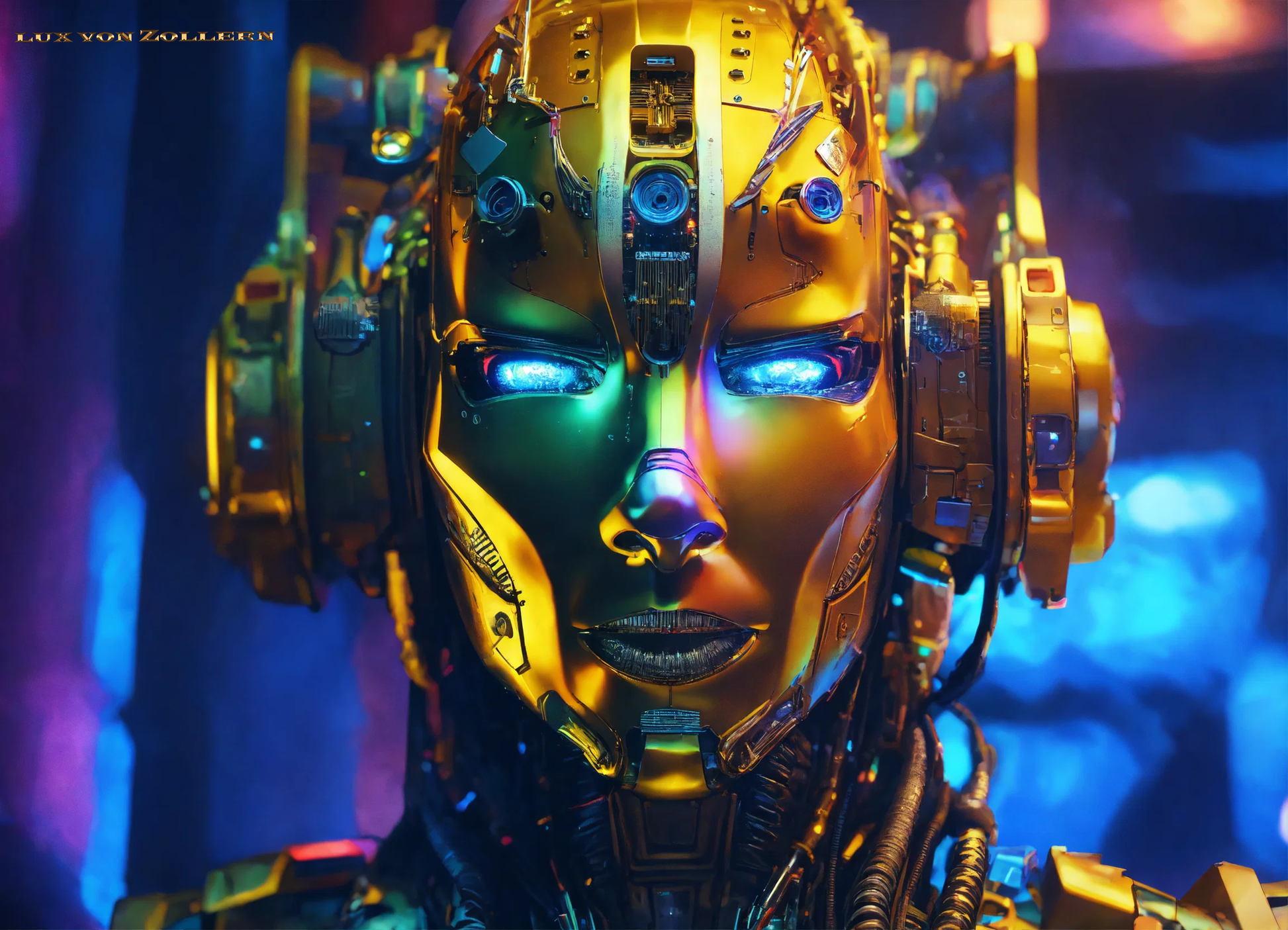 There is an undeniable allure to Shiny Objects by Lux von Zollern. With its gleaming golden robot heads, intricate detailing, and electric neon eyes, the collection invites viewers to marvel at the dazzling beauty of artificial intelligence. Yet, beneath the surface of its stunning visuals, Shiny Objects forces us to confront a darker reality: the very technology that promises to revolutionize our world also brings with it the potential for profound disruption, inequality, and loss of control. Through the use of metaphor, symbolism, and expertly crafted imagery, Lux von Zollern has created a collection that captures both the seductive beauty and the unsettling consequences of our growing reliance on AI.