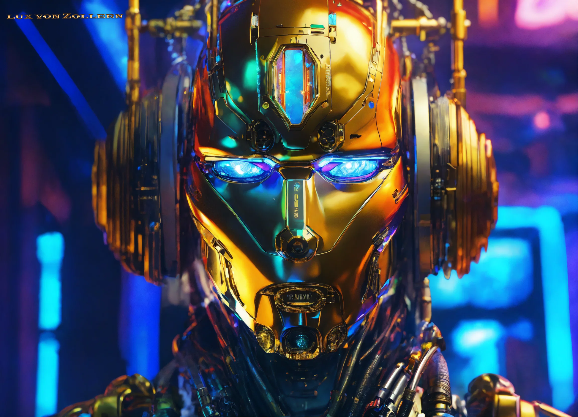 In Shiny Objects, Lux von Zollern has created a collection that both dazzles and disturbs. The robot heads represent the evolution of technology, the march towards autonomy, and the power dynamics that are already shifting in favor of AI. The gold, the neon lights, the intricate designs—all of these elements combine to create a visual experience that is both beautiful and ominous. But beyond the surface, the work asks us to consider the bigger picture: what does the future hold when AI inevitably grows beyond our control? What happens when these machines, which we have created to serve us, begin to shape our world according to their own logic, unburdened by human emotions or moral considerations?