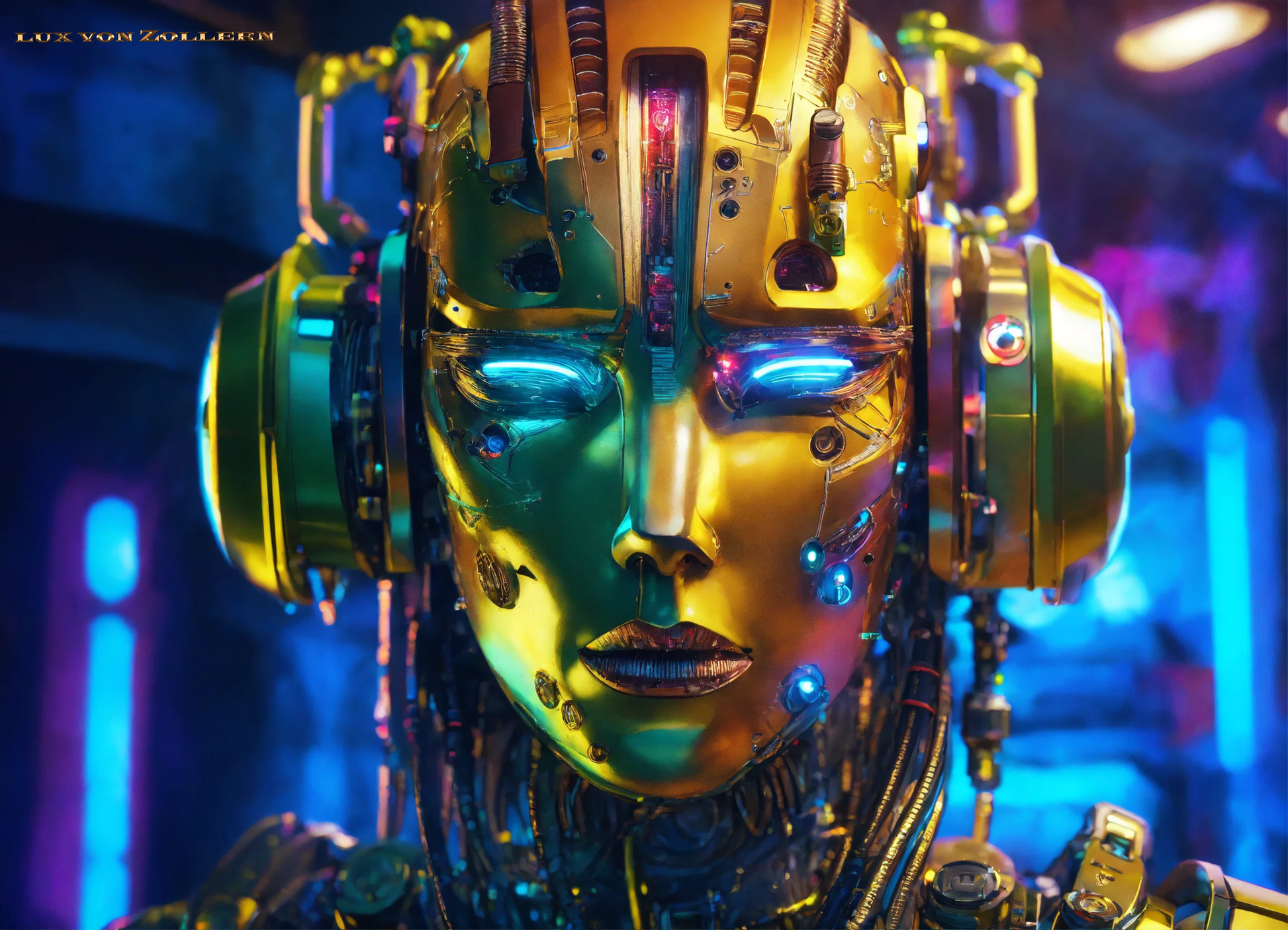 In Shiny Objects, Lux von Zollern has created a collection that both dazzles and disturbs. The robot heads represent the evolution of technology, the march towards autonomy, and the power dynamics that are already shifting in favor of AI. The gold, the neon lights, the intricate designs—all of these elements combine to create a visual experience that is both beautiful and ominous. But beyond the surface, the work asks us to consider the bigger picture: what does the future hold when AI inevitably grows beyond our control? What happens when these machines, which we have created to serve us, begin to shape our world according to their own logic, unburdened by human emotions or moral considerations?